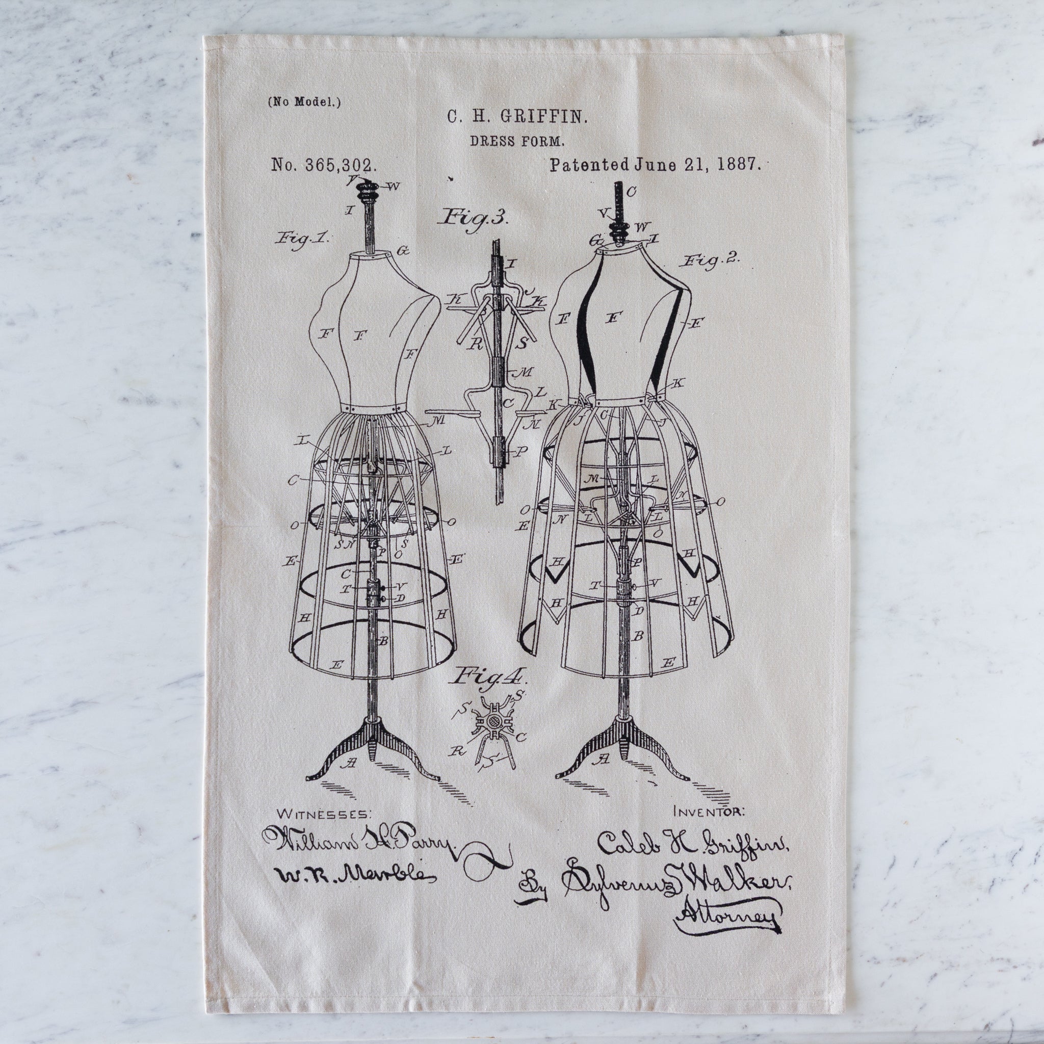 Tea towel with dress form patent design on a textured surface.
