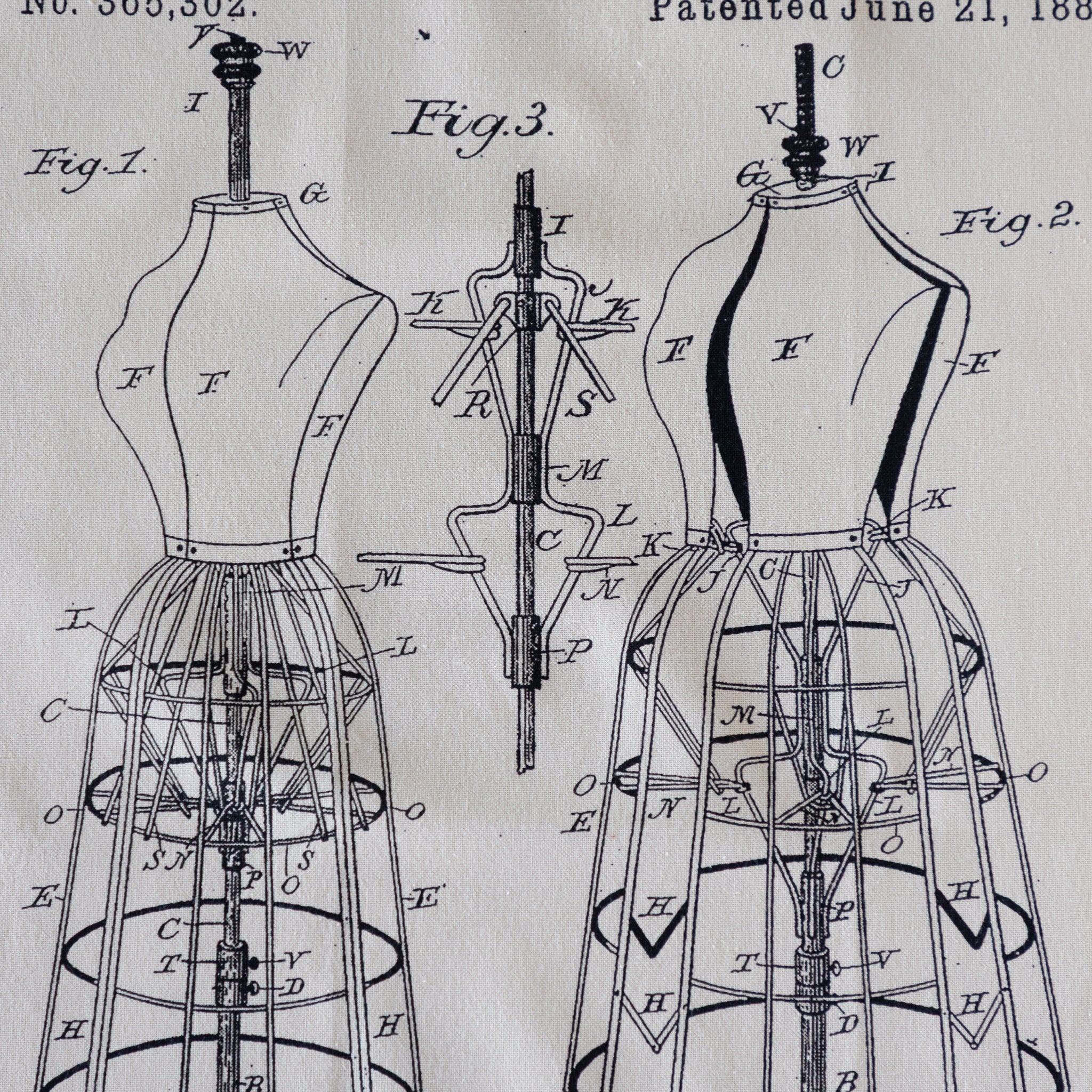 Vintage patent illustration of a dress form with detailed labeled parts on a tea towel.