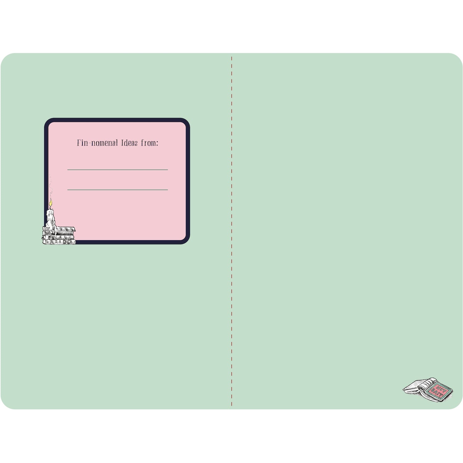 The inside front and back covers of the Deep End Notebook are solid mint green with a box labeled "Fin-omenal ideas from:" and two blank lines in the front, and a small illustrated open book in the lower right corner of the inside back cover.