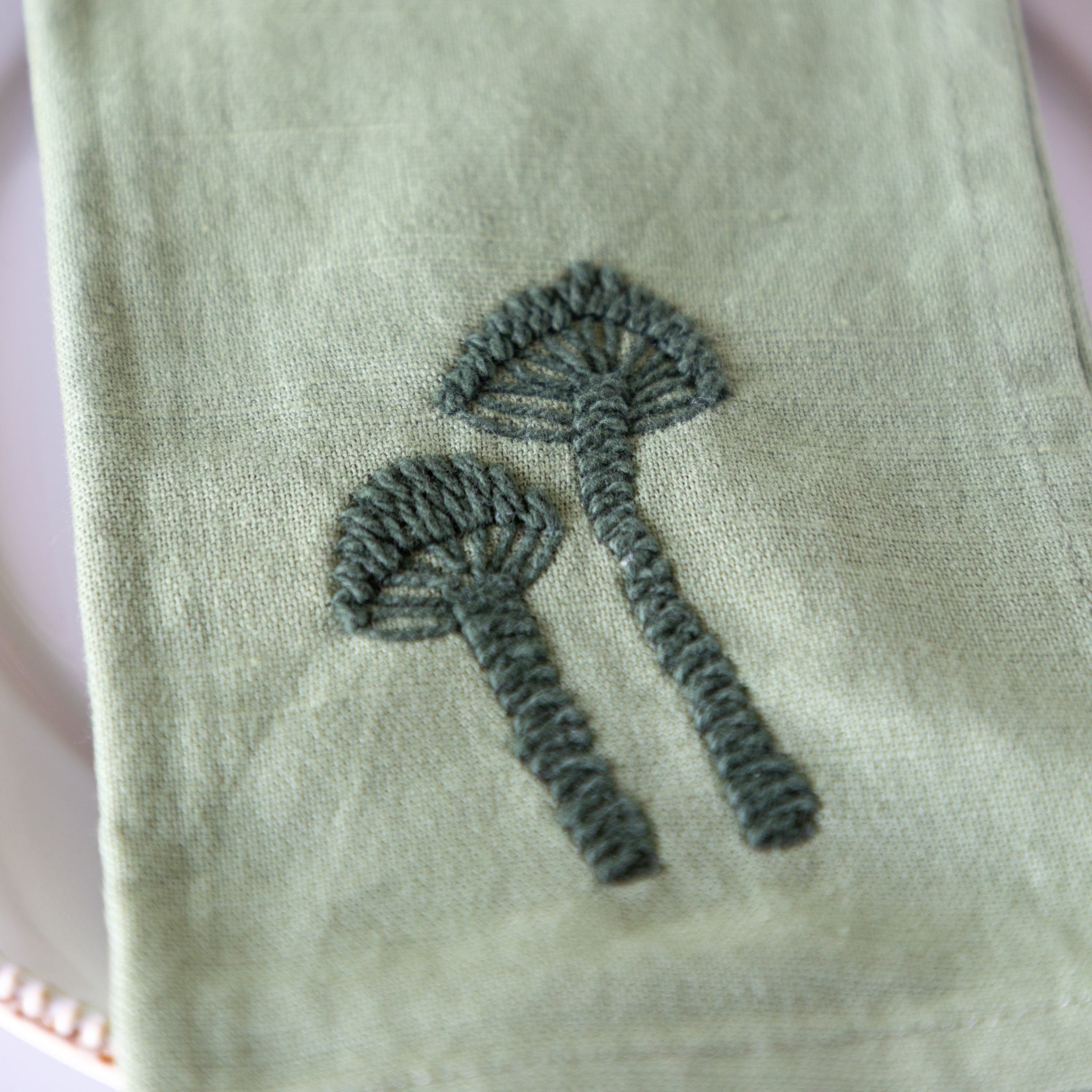 Set of green napkins with embroidered mushrooms on a marble surface.