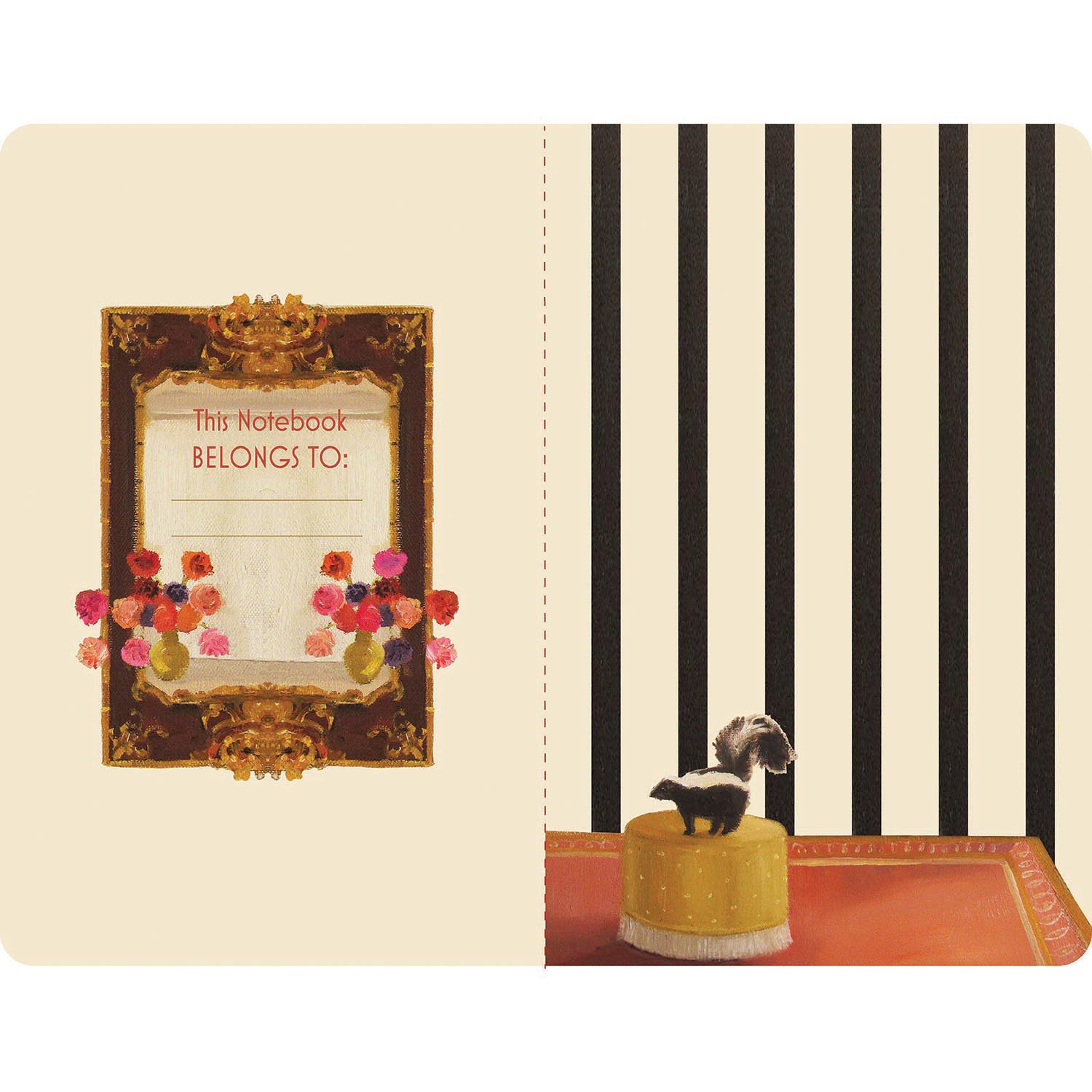 The front and back inside covers of the Lisette vs. Skunk Notebook, featuring an elegant floral frame reading "This Notebook Belongs To:" with two lines in the front cover, and the skunk from the illustration over black and white vertical stripes inside the back cover.