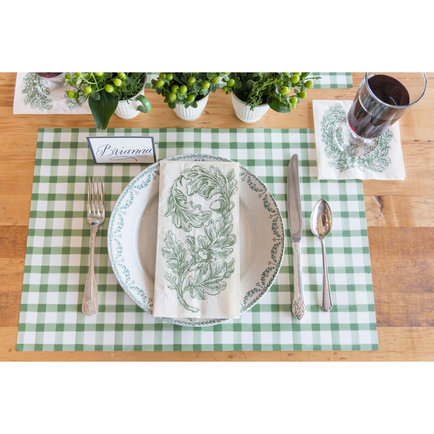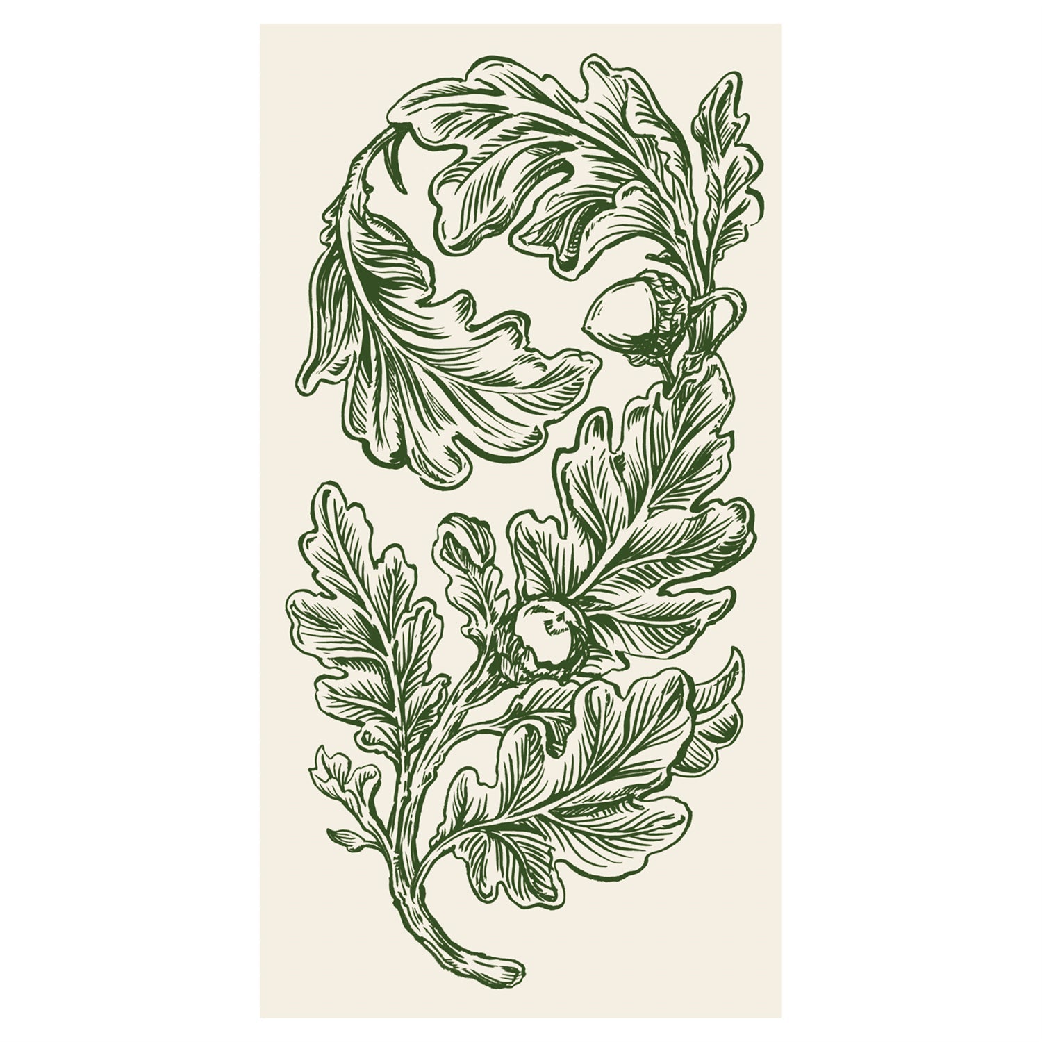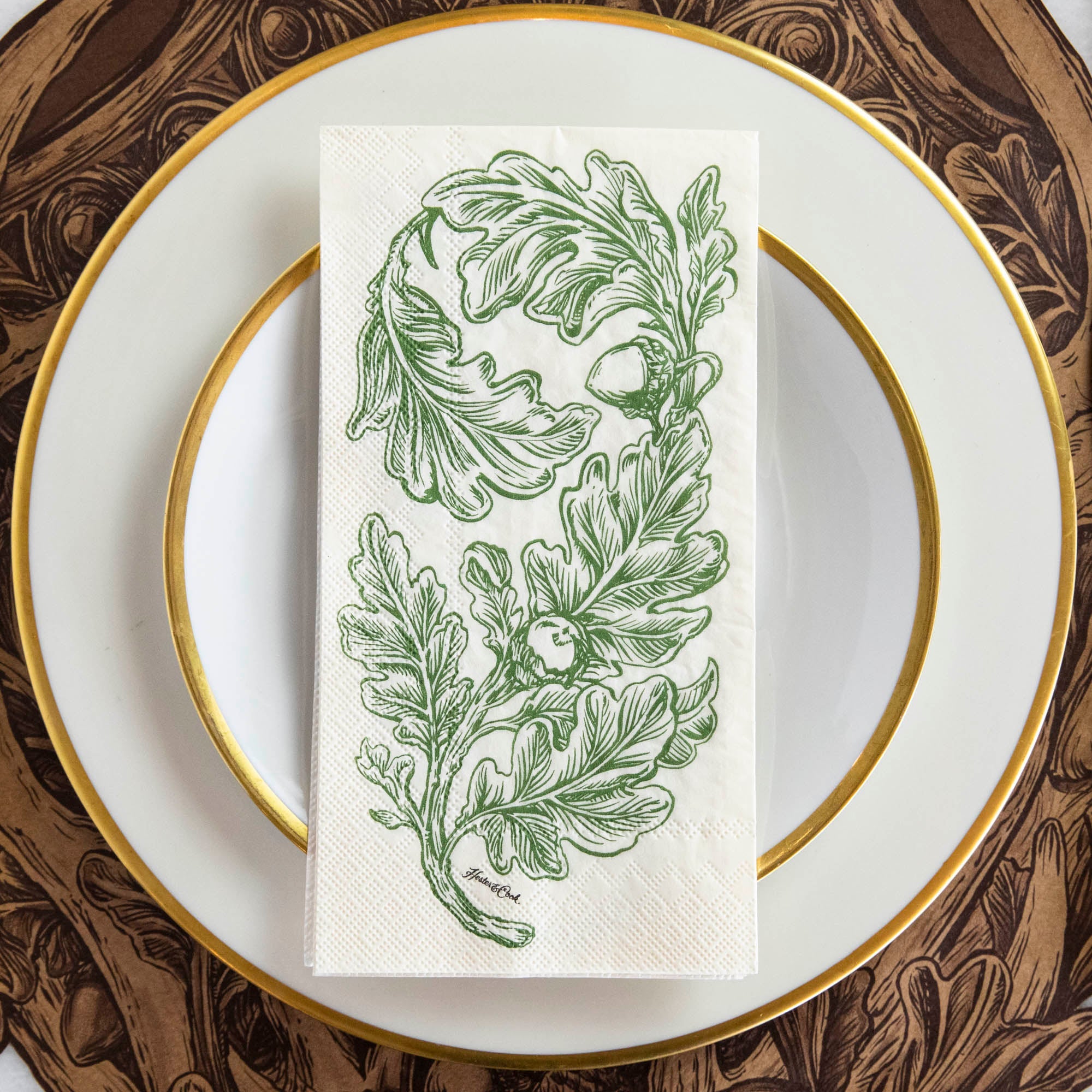 A rectangle, white guest napkin featuring a dark green engraving-style illustration of a curved, leafy oak branch with acorns.