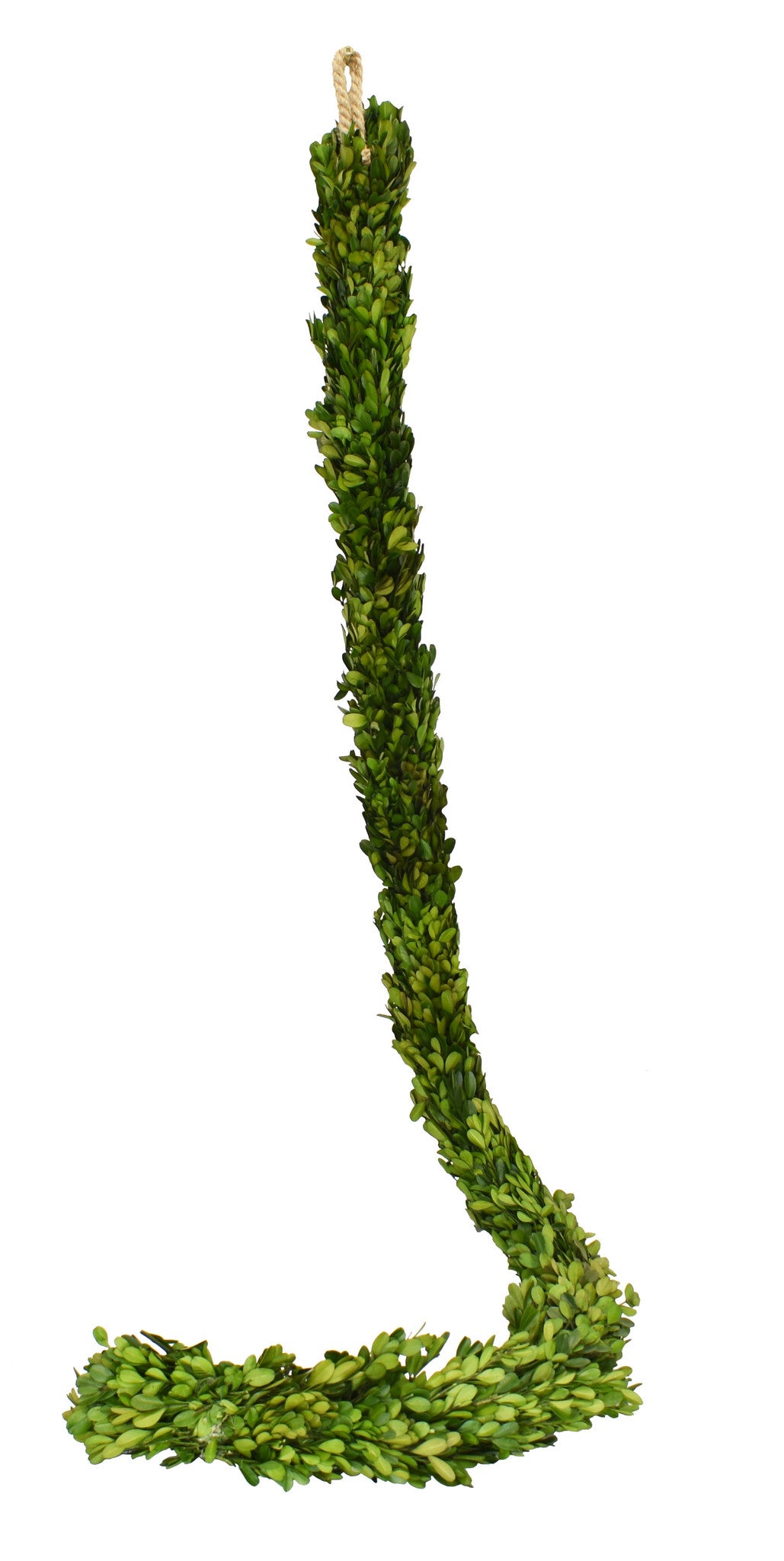 This 71" lush green garland, with a thick loop of rope on each end, is covered in boxwood leaves that are preserved to keep the bold color year after year. Lightly mist and keep out of direct sunlight to preserve the quality of this piece for longer.