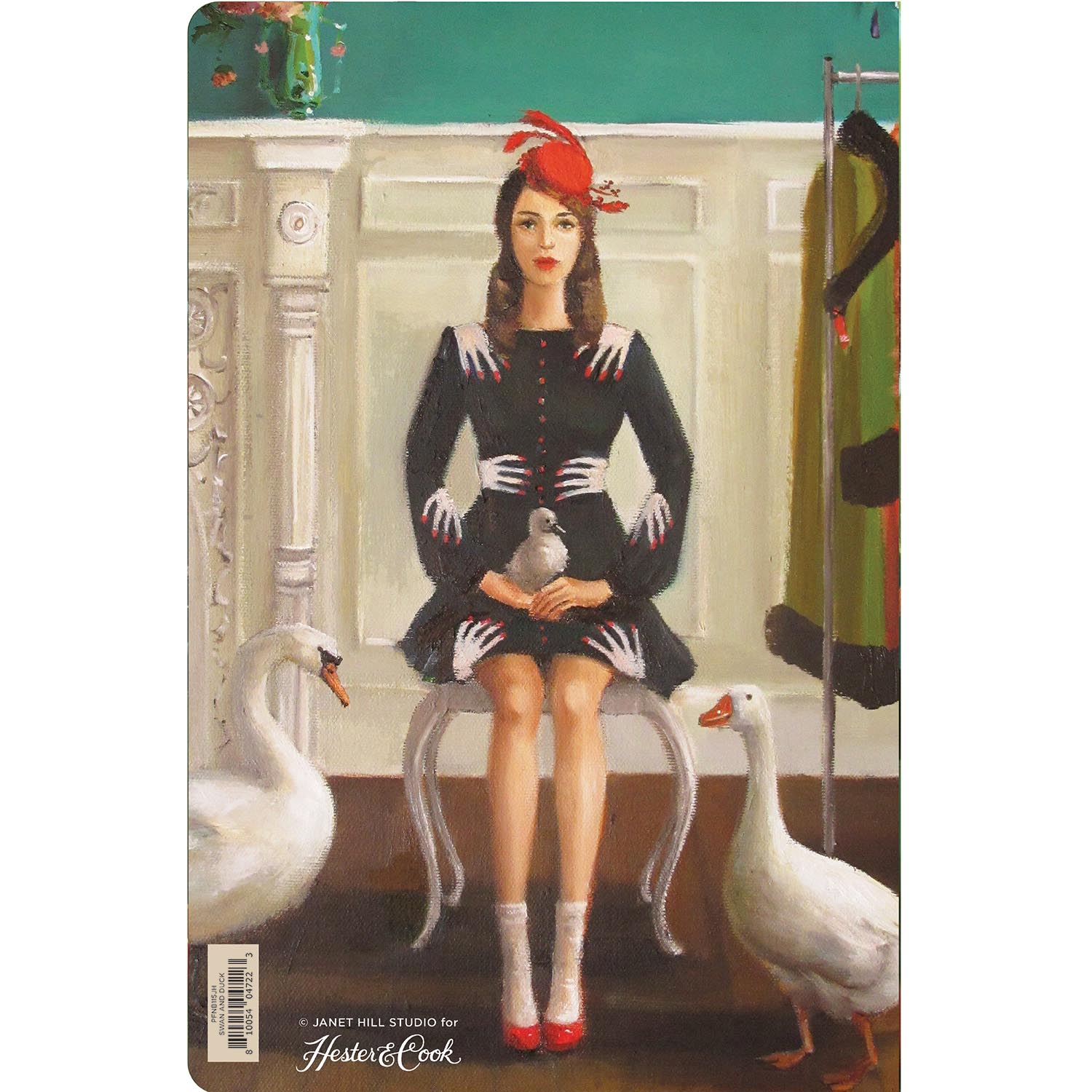 The front cover of the Swan and Duck Notebook, featuring a painterly illustration of a woman in a vintage black dress patterned with hands sitting in a chair in a luxurious room with a baby swan in her lap. An adult swan and an adult white duck stand on either side of her.