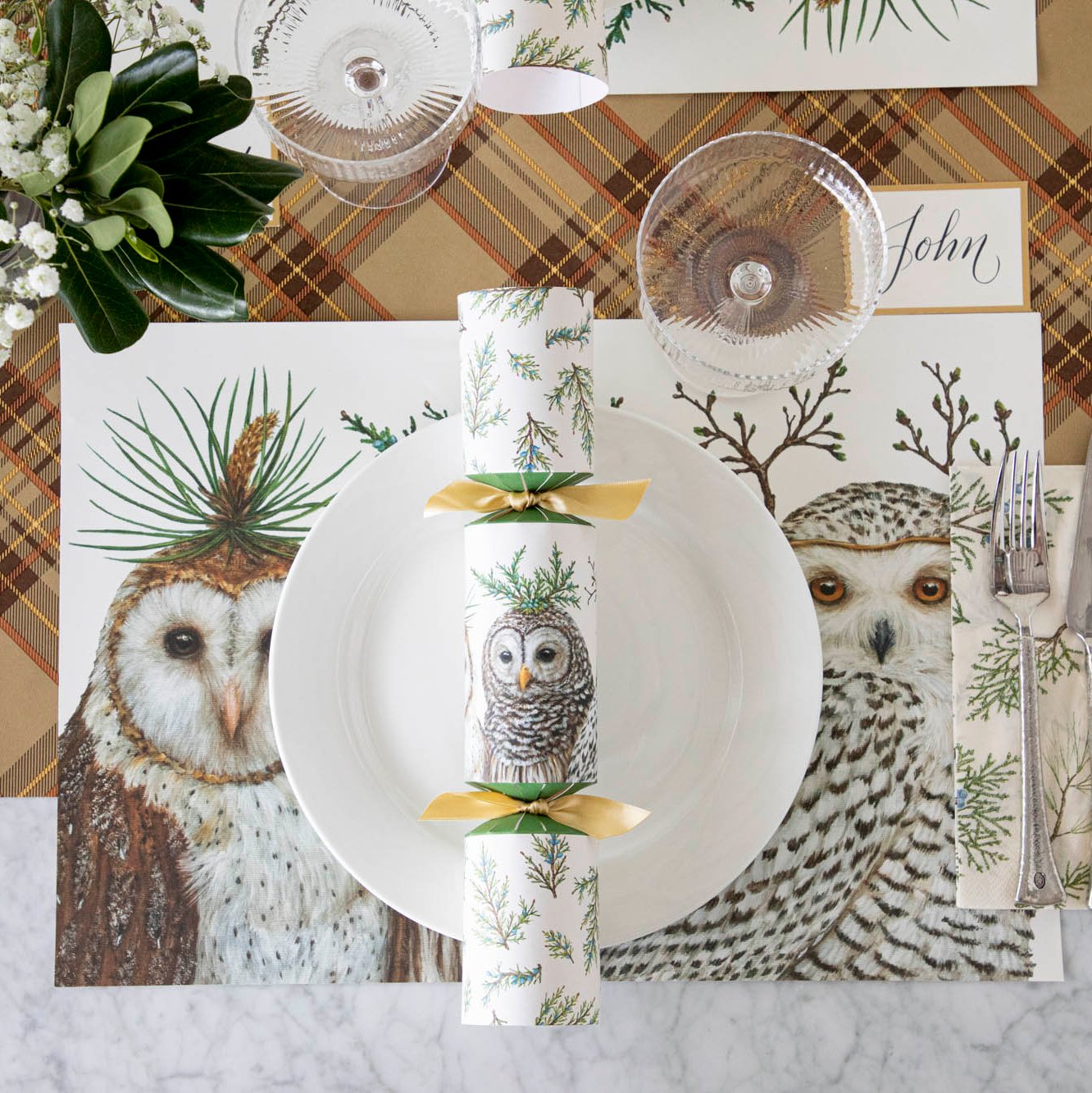 Table setting featuring a Winter Owls Cracker on a white plate, on top of a Die-cut Wood Slice Placemat and Winter Owls Placemat with an Autumn Plaid Runner underneath.